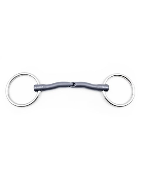 Fager Jasmine titanium – liikkuva rengas kuolainta voi käyttää kaksin päin, niin että kuolaimessa on pieni kielentila ja vähemmän kielenpainetta tai toisinpäin, niin että kuolaimessa on vähemmän hammasloman painetta.